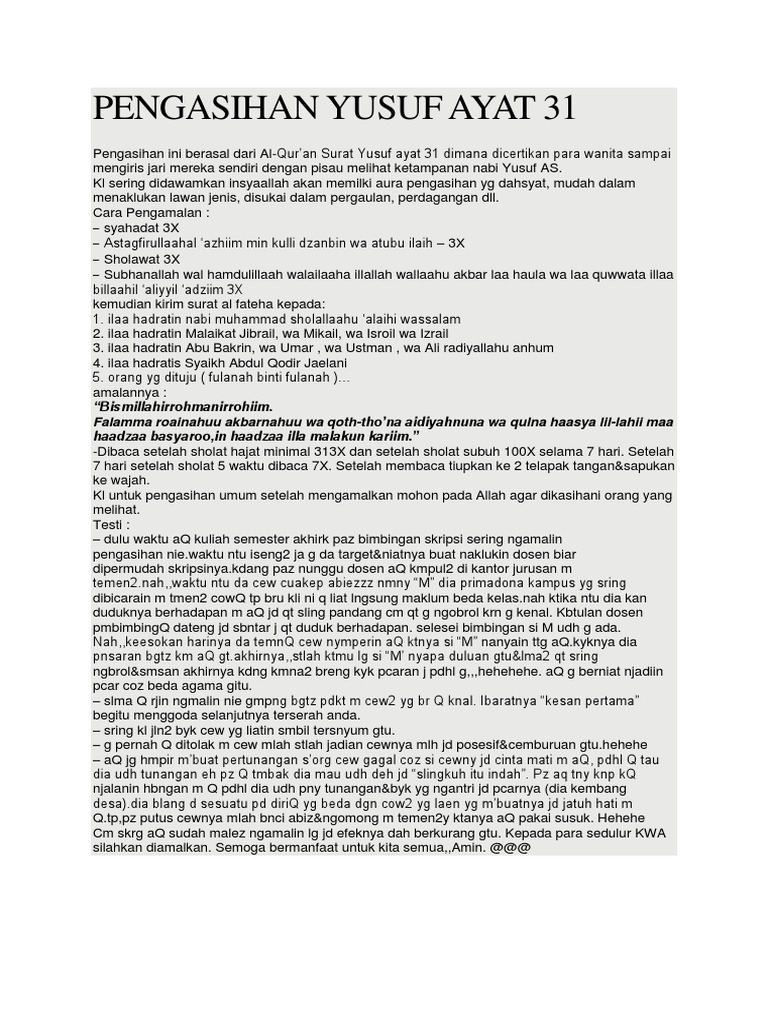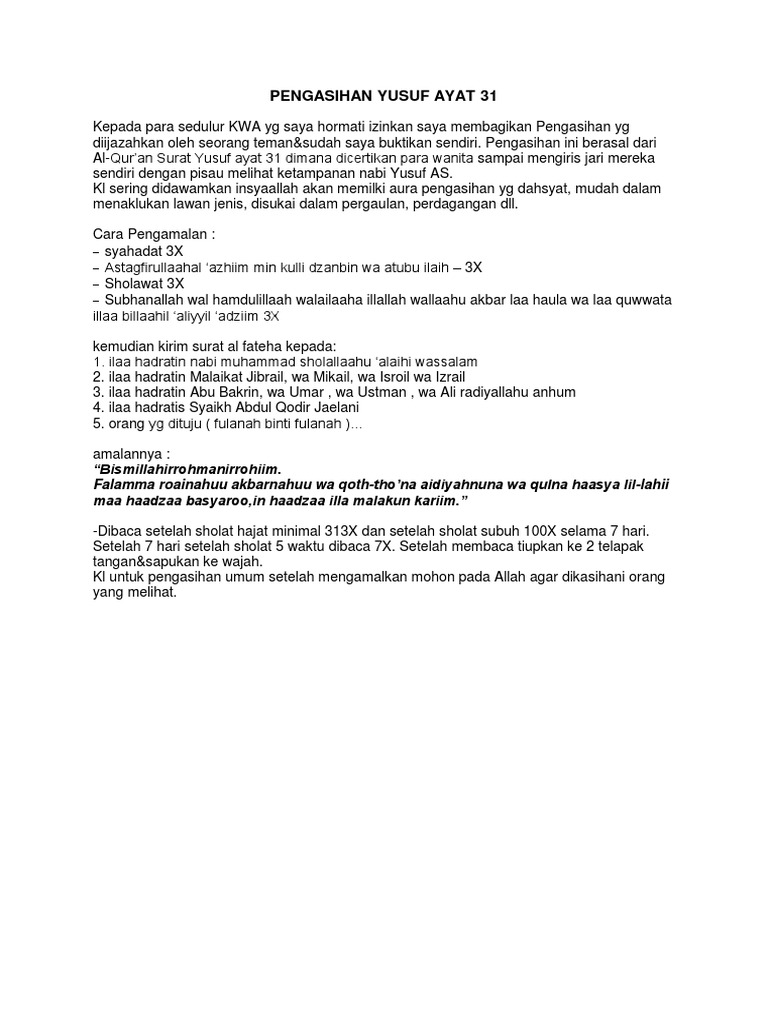 Ijazah pengasihan nabi yusuf. Sehingga wanita yang melihat beliau itu pun hinnga tidak sadarkan diri telah menyayat tangannya dengan pisau. Bila diamalkan dengan penuh kemantapan dan istiqomah insya allah aura pengasihan yang dahsyat bakal nampak serta gampang dalam mengalahkan lawan jenis serta disenangi beberapa orang dalam pergaulan. Atau menjaga diri dari hadas dan najis manakala membaca wirid.